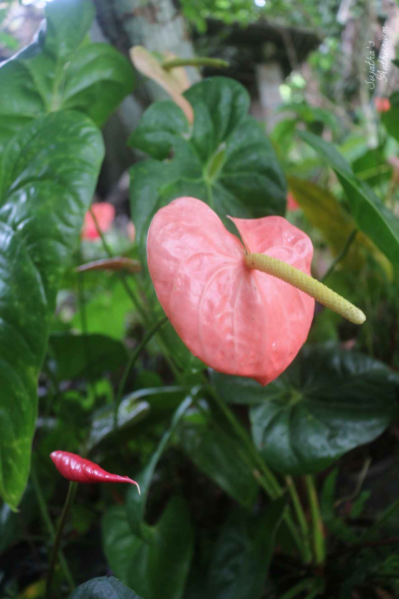 This anthurium flower has a nice orange color spathe. Heart shaped spathe turns mild pink and green over time. Spadix is yellow when young and green when it's old. Relatively large plant.